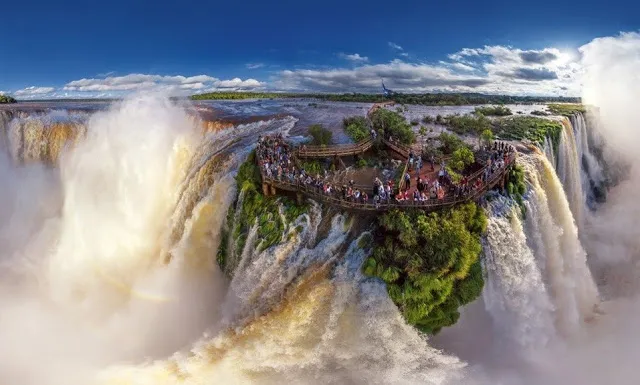As Cataratas do Iguaçu estão localizadas na fronteira entre a Argentina e o Brasil e são consideradas uma das Novas Sete Maravilhas do Mundo. Estendendo-se por uma distância de 2 km, com uma vazão média de 1,3 milhão de litros por segundo, as Cataratas do Iguaçu são compostas por aproximadamente 275 quedas d'água individuais.